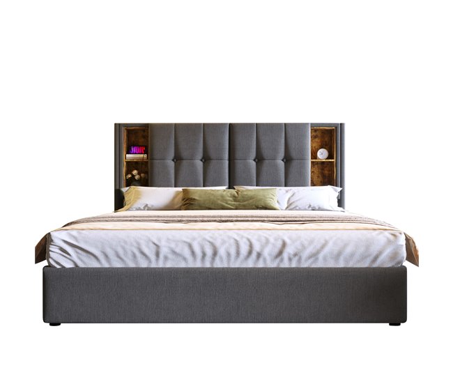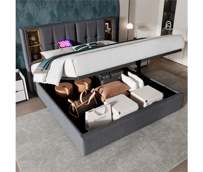 Cama con almacenaje acolchada 160×200 cm – con carga inalámbrica y cabezal de almacenaje – tejido de algodón – Gris