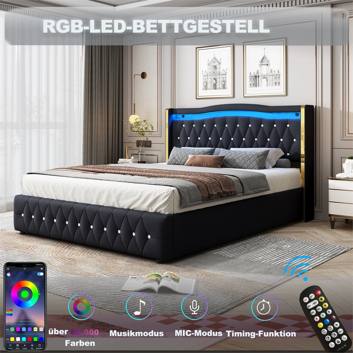 Cama contenedor acolchada 140×200 cm con iluminación LED – tejido de terciopelo – Negro