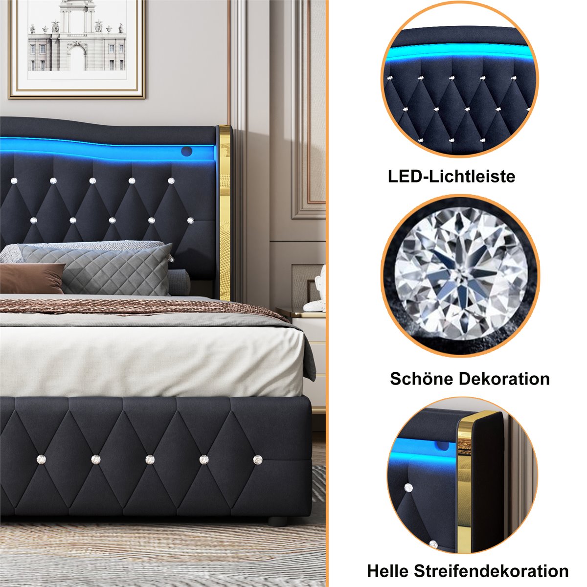 Cama contenedor acolchada 160×200 cm con iluminación LED – tejido de terciopelo – Negro