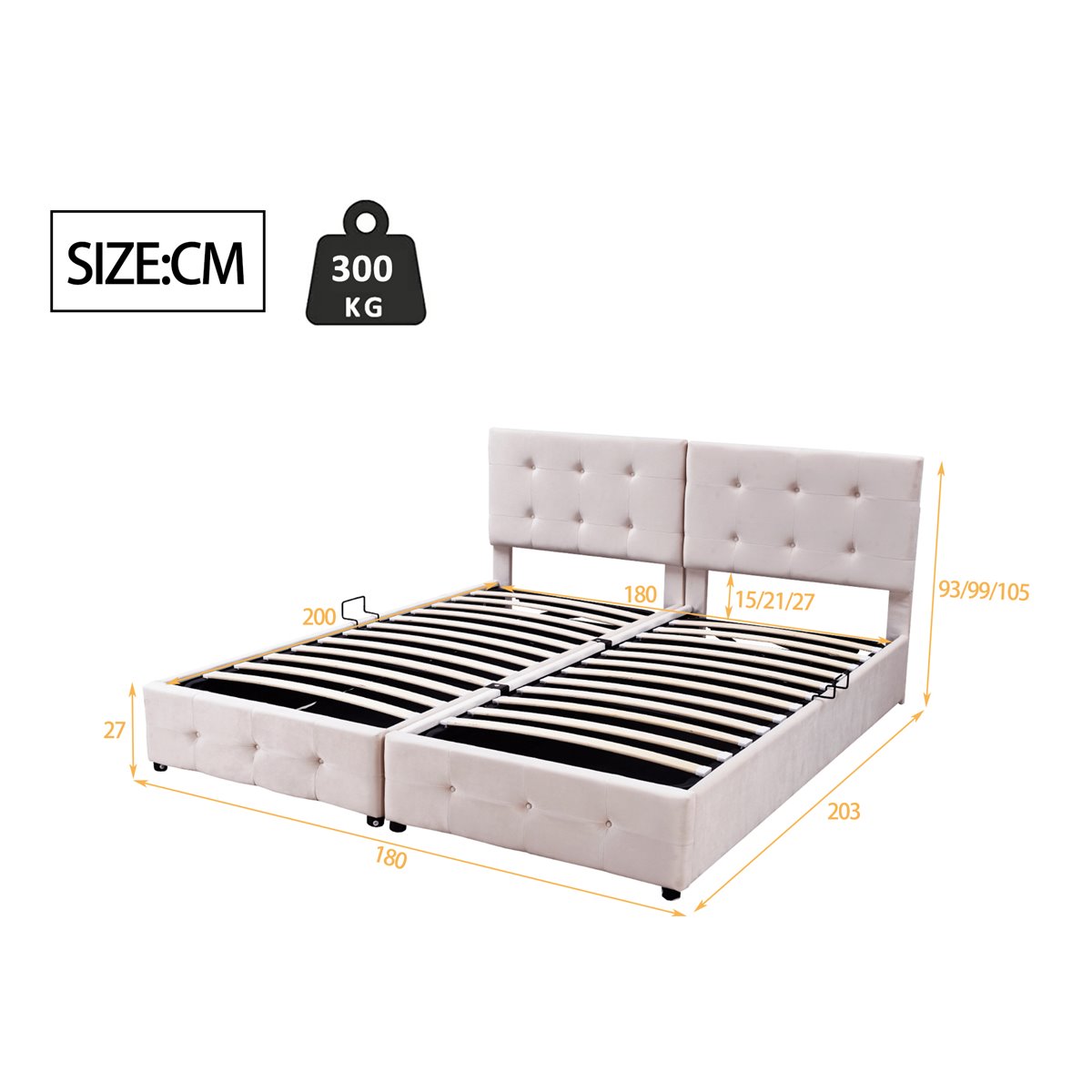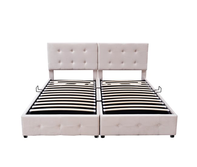 Equipada con almacenamiento hidráulico y un somier de láminas altas, esta cama tapizada ofrece mucho espacio de almacenamiento para que puedas organizar tu habitación de manera rápida y sencilla. Una cama tapizada en suave terciopelo crea un lugar cómodo y acogedor para dormir, adecuado para cualquier estilo de interior.
