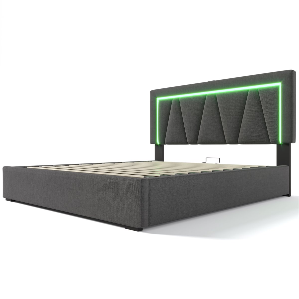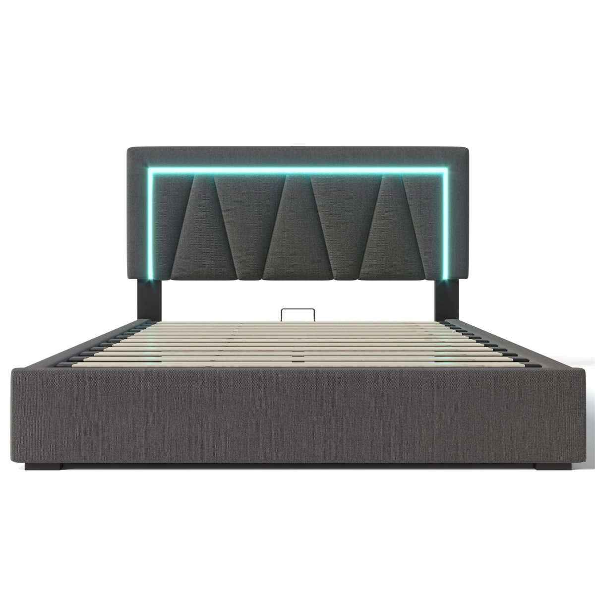 Cama contenedor tapizada 160x200cm con LED y puerto de carga USB y tipo C – Tela de lino – Somier de láminas – Gris