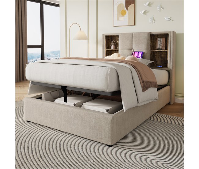 Cama individual 90x200cm – Carga inalámbrica USB-C, con almacenamiento, base de madera, lino natural (Con colchón).