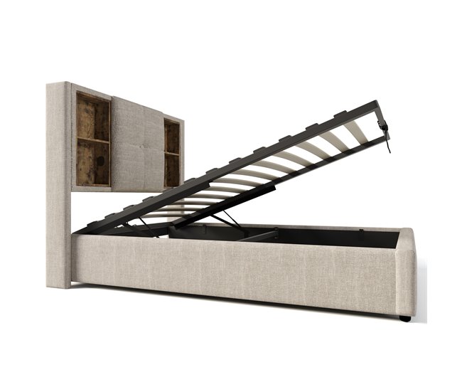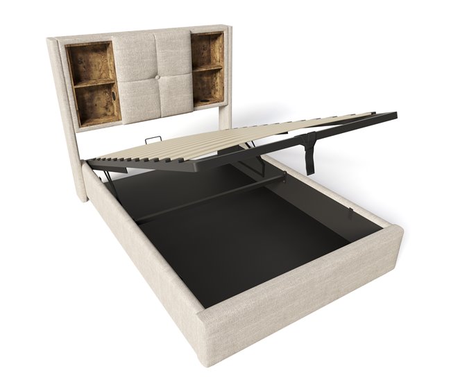 Una de las principales ventajas de esta cama es su amplio espacio de almacenamiento. La base de madera se combina con compartimentos prácticos que permiten guardar ropa de cama, mantas o cualquier objeto que desees tener a mano pero fuera de la vista. Este diseño optimiza el espacio disponible, manteniendo la habitación ordenada y funcional, especialmente en espacios reducidos.