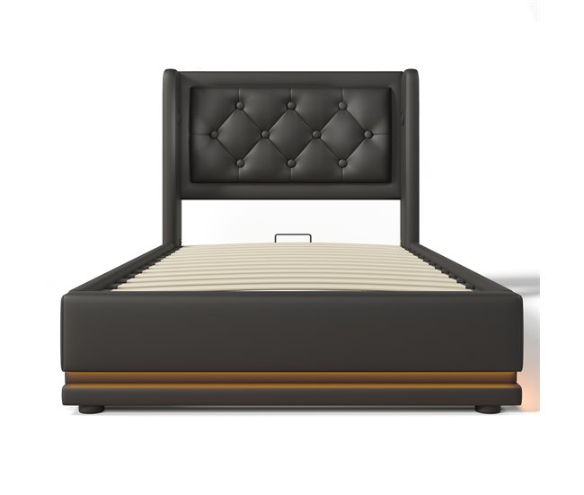 Cama individual 90*200 cm – Cabezal acolchado con función LED 3 lados, almacenamiento hidráulico, material PU negro
