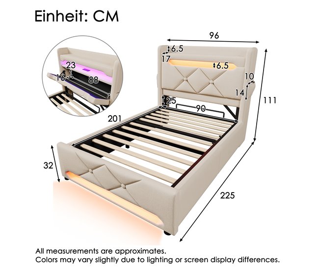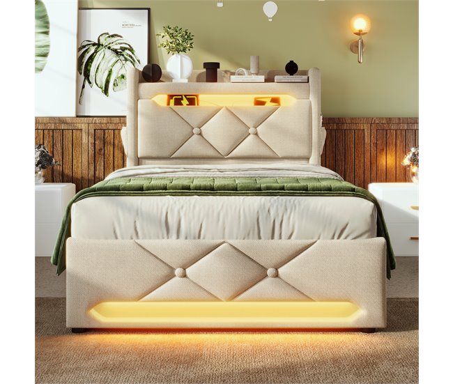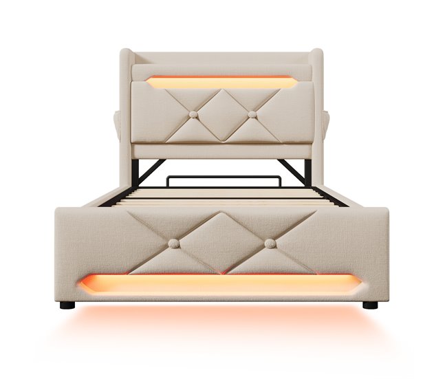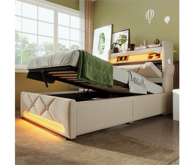 Cama individual 90×200 – Cabecero con almacenamiento y puertos USB y tipo C, función LED 360 alrededor, con almacenamiento hidráulico – Beige