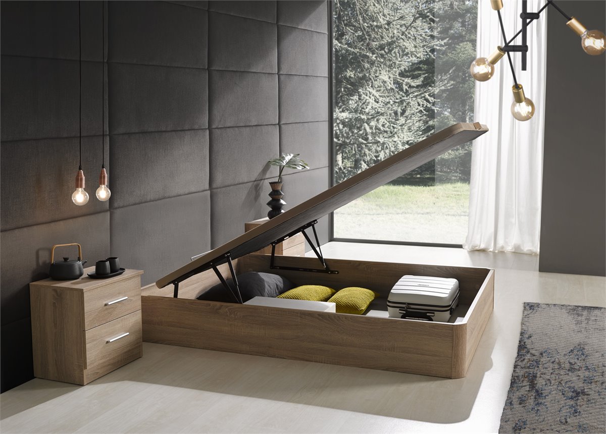 El canapé incorpora un mecanismo abatible de alta calidad, que permite abrir y cerrar la tapa de manera suave y sin esfuerzo. Sus amortiguadores aseguran un movimiento silencioso y estable, proporcionando seguridad y comodidad en el uso diario. Además, la base superior del canapé ofrece un soporte firme y adecuado para cualquier colchón, mejorando la estabilidad y el confort durante el descanso.