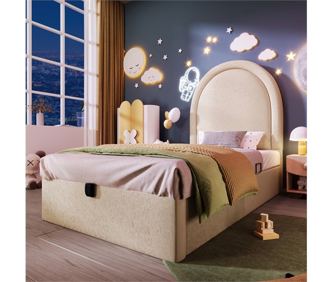 Cuna tapizada similar a un diseño – 90×200 cm – Con almacenaje – Beige