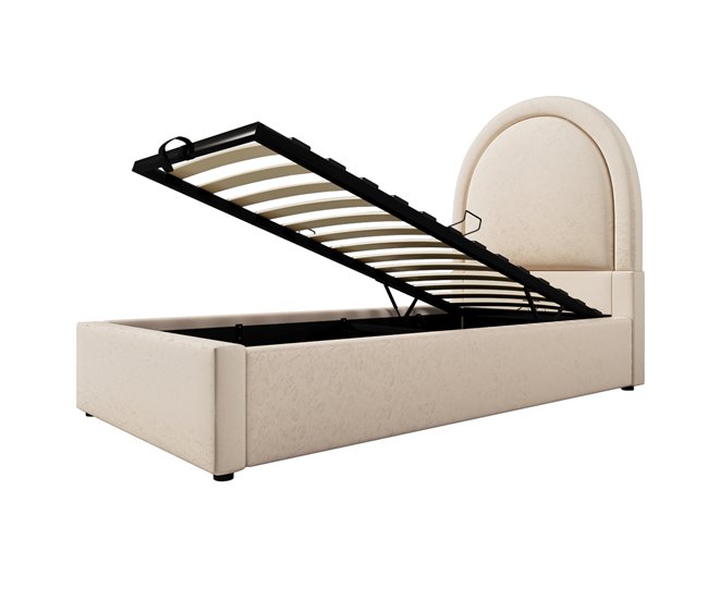 La cama tapizada está equipada con una base de láminas hidráulica que permite levantar fácilmente el colchón mediante cordones ajustables para utilizar el espacio de almacenamiento debajo de la cama.