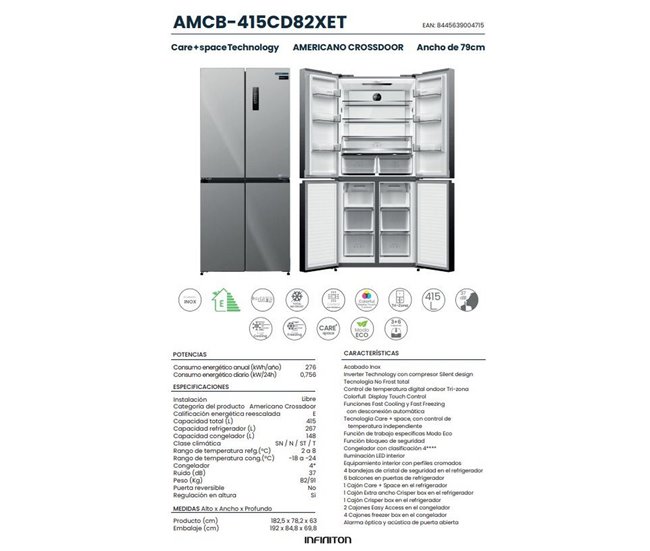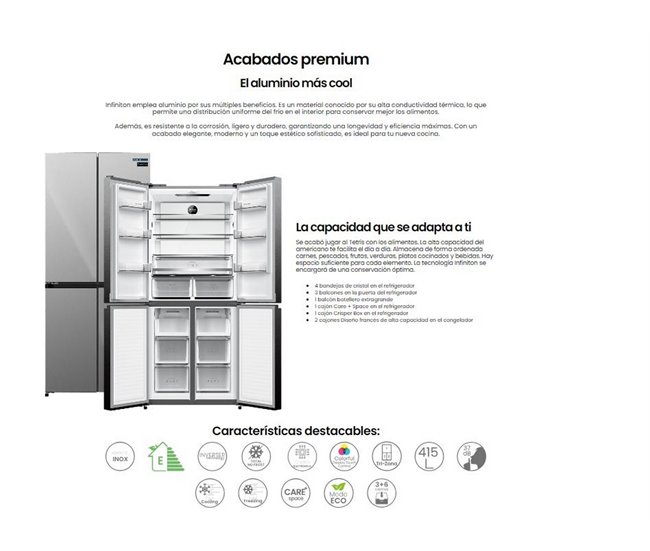 El Infiniton AMCB-415CD82XET es una opción ideal para quienes buscan un frigorífico americano moderno, eficiente y espacioso. Su combinación de diseño elegante, tecnología avanzada y almacenamiento inteligente lo convierte en un electrodoméstico confiable y práctico para cualquier hogar.