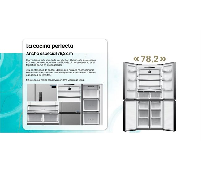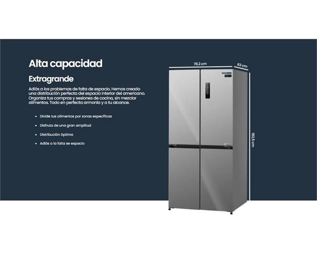 El frigorífico americano Infiniton AMCB-415CD82XET combina estilo y funcionalidad con un acabado en acero inoxidable que aporta un toque moderno a cualquier cocina. Con una altura de 182,5 cm, este modelo americano destaca por sus líneas elegantes y su presencia imponente, ideal para quienes buscan un electrodoméstico que sea al mismo tiempo práctico y decorativo.