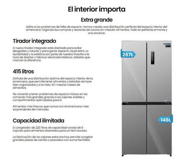 Con una capacidad total de 415 litros, este frigorífico americano ofrece espacio suficiente para almacenar alimentos frescos y congelados de manera organizada. Sus amplios compartimentos, estantes ajustables y cajones para frutas y verduras permiten una distribución eficiente de los productos, mientras que los compartimentos del congelador facilitan el almacenamiento de grandes cantidades de alimentos congelados, ideal para familias medianas y grandes.