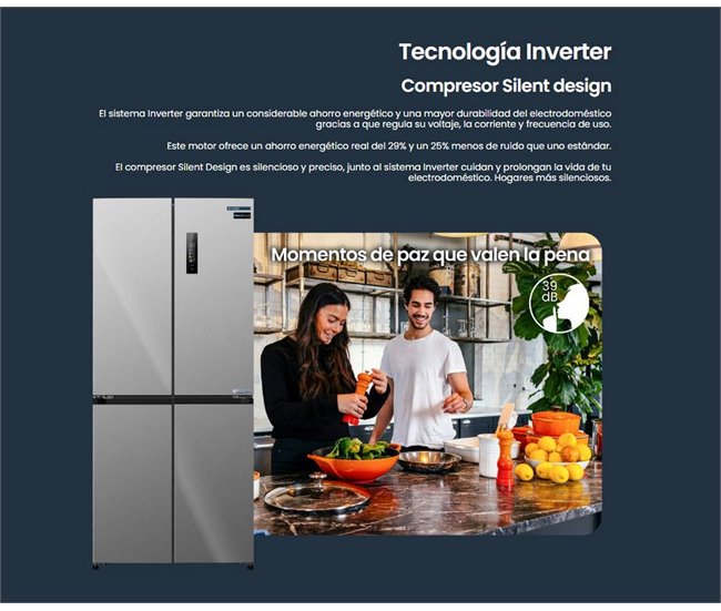 Gracias a su tecnología Inverter, el Infiniton AMCB-415CD82XET ajusta automáticamente la velocidad del compresor según las necesidades de refrigeración, garantizando un consumo energético optimizado y una temperatura más estable. Además, cuenta con sistema No Frost, evitando la formación de escarcha y eliminando la necesidad de descongelar manualmente. Su clasificación energética E combina rendimiento con eficiencia, ayudando a reducir el consumo eléctrico sin comprometer la calidad del frío.
