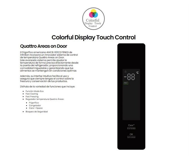 Acabado InoxInverter Technology con compresor Silent designTecnología No Frost totalControl de temperatura digital ondoor Tri-zonaColorfull Display Touch ControlFunciones Fast Cooling y Fast Freezing con desconexión automáticaTecnología Care + space, con control de temperatura independienteFunción de trabajo específicas Modo EcoFunción bloqueo de seguridadCongelador con clasificación 4****Iluminación LED interiorEquipamiento interior con perfiles cromados4 bandejas de cristal de seguridad en el refrigerador6 balcones en puertas de refrigerador1 Cajón Care + Space en el refrigerador1 Cajón Extra ancho Crisper box en el refrigerador1 Cajón Crisper box en el refrigerador2 Cajones Easy Access en el congelador4 Cajones freezer box en el congeladorAlarma óptica y acústica de puerta abierta)