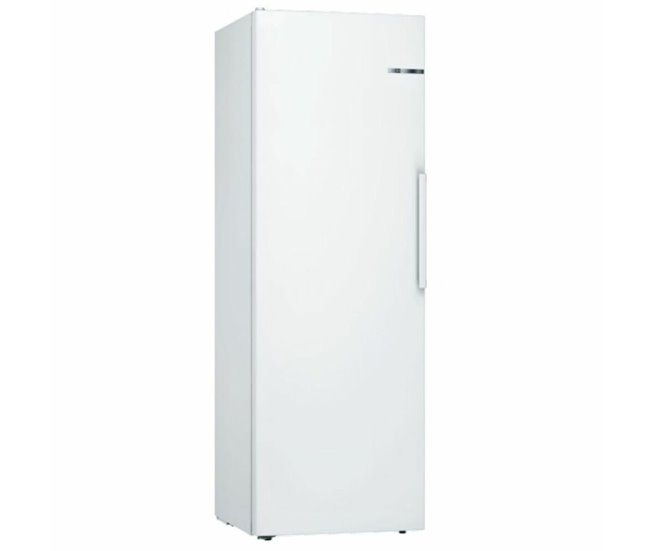 El Bosch KSV33VWEP es un frigorífico de una sola puerta con acabado en blanco, ideal para integrarse de forma limpia en la cocina. Sus dimensiones son 176 cm de alto, 60 cm de ancho y 65 cm de profundidad, ofreciendo un buen volumen sin ocupar demasiado espacio.
