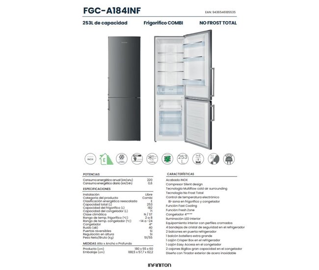 El Infiniton FGC‑A184INF es un frigorífico tipo combi con una altura de 180 cm. Su acabado en acero inoxidable (Inox) le da un aspecto moderno y resistente. infiniton.es+2Carrefour+2